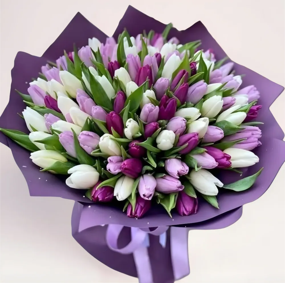 101 тюльпан фиолетовый микс — это сложная по оттенкам композиция, построенная на сочетании светлых и глубоких фиолетовых тонов. Такой микс создает эффект многослойности. Букет не выглядит плоским или однородным, а наоборот — имеет глубину и объем. Большое количество тюльпанов формирует плотную структуру, которая выглядит красиво с любого ракурса. Фиолетовая палитра легко адаптируется к различному освещению и среде, поэтому композиция выглядит по-разному днем и вечером. У нас можно купить 101 тюльпан фиолетовый микс с бесплатной доставкой по Алматы.