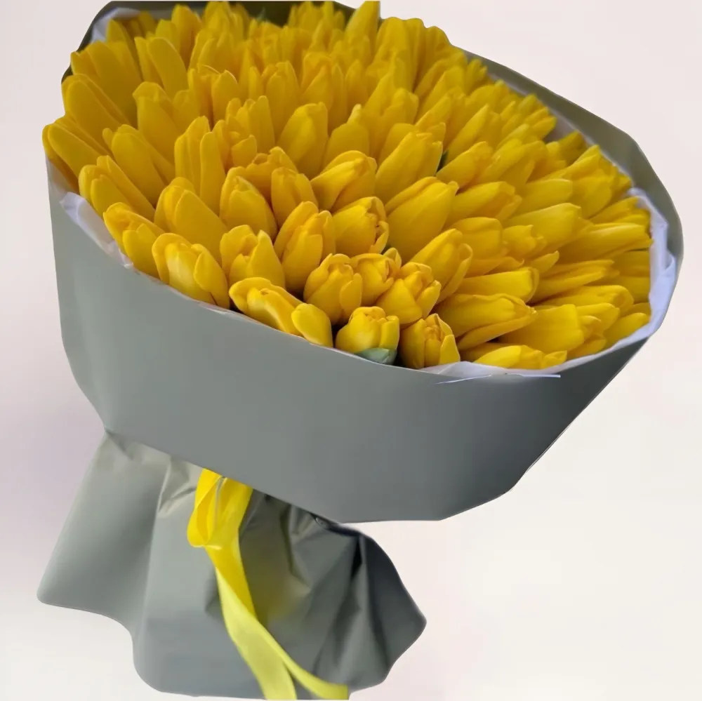 Композиция из 101 желтого тюльпана выглядит по-настоящему эффектно. Плотные, упругие бутоны формируют пышную цветочную поверхность, создавая ощущение достатка и праздничности. Желтый цвет ассоциируется с солнцем, теплом, оптимизмом и внутренней силой, поэтому такой букет мгновенно вызывает положительные эмоции. Аккуратная упаковка поддерживает форму композиции и позволяет цветам оставаться главным акцентом. Заказывайте 101 желтый тюльпан Алматы онлайн или по телефону.