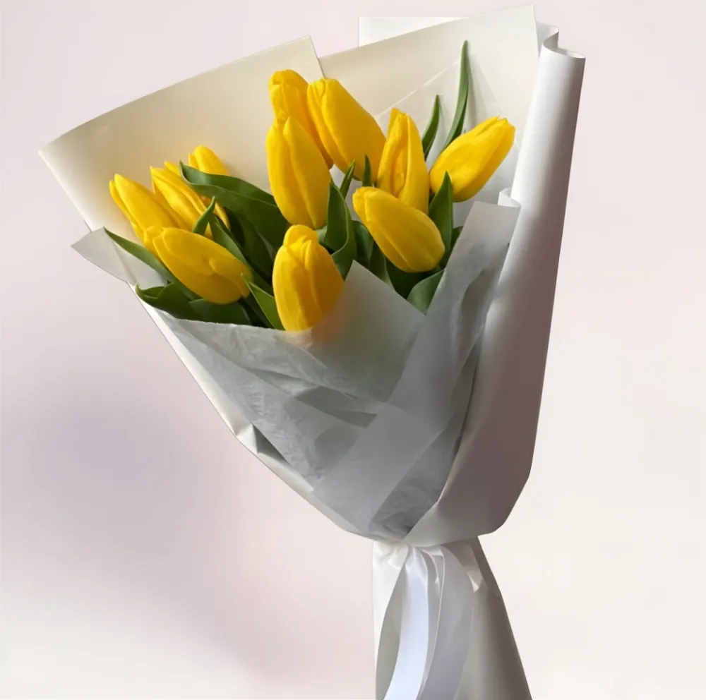 Этот букет выглядит ярко, но сдержанно. Одиннадцать желтых тюльпанов формируют объемную, сбалансированную композицию с четким ритмом и естественной легкостью. Насыщенный желтый цвет ассоциируется с солнцем, теплом и положительными эмоциями, а светлая упаковка придает букету аккуратность и современный вид. Композиция уместна как в праздничный день, так и в будние дни.