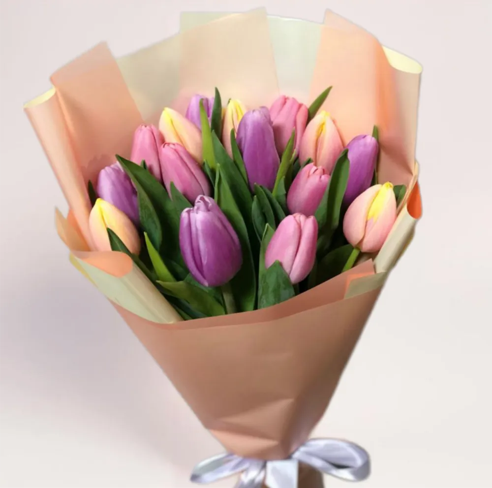 Микс в этой композиции — это не просто набор разных тюльпанов, а сочетание оттенков, которые дополняют друг друга. Розовые, фиолетовые, кремовые и желтые бутоны создают многослойную палитру без резких контрастов. 15 микс тюльпанов в Алматы дают достаточный объем, чтобы букет выглядел насыщенно, но в то же время оставался легким и современным. Упаковка с теплым оттенком объединяет композицию и подчеркивает премиальный характер сборки.