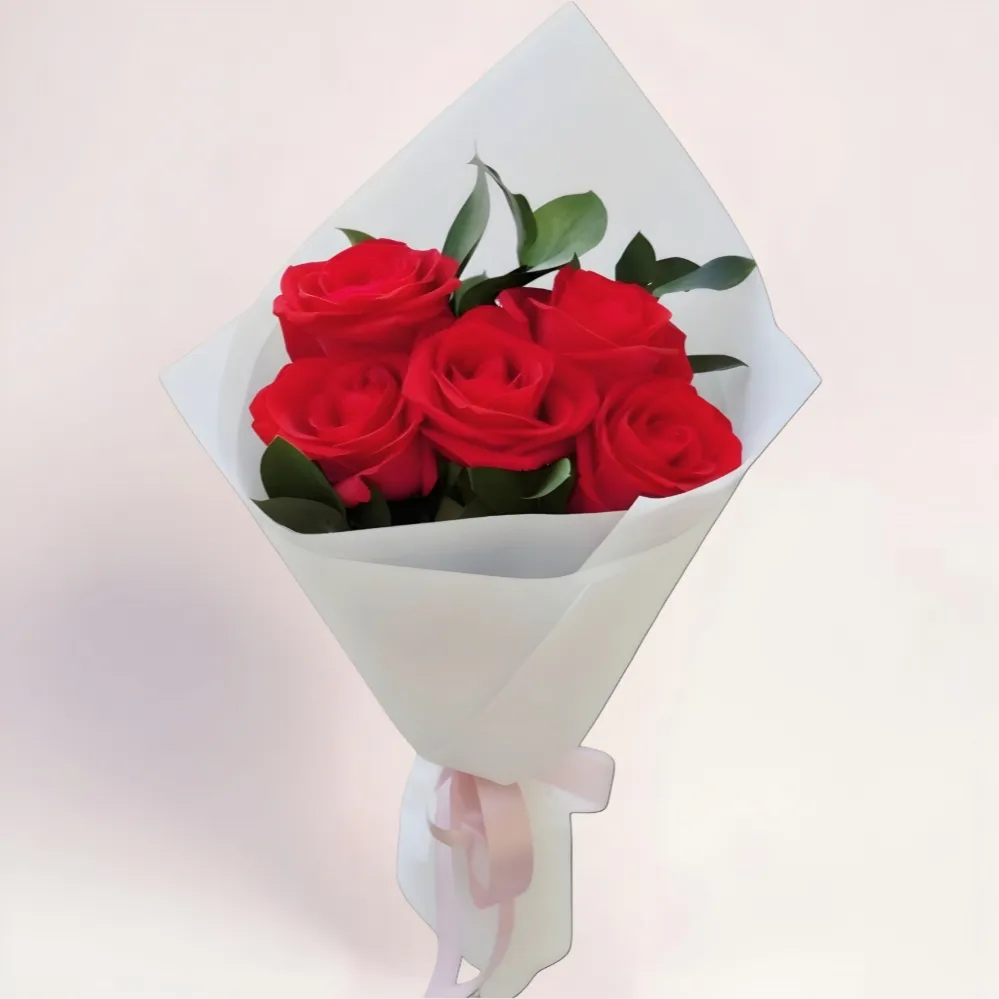 Красные розы – необычные цветы. Букет из них – зашифрованное послание, выражающее сильные, глубокие чувства. Купить и подарить 5 красных роз можно по любому поводу. Упаковочная бумага белого цвета безупречно подчеркивает яркость плотных крупных бутонов. Светло-розовая лента служит гармоничным дополнением композиции.