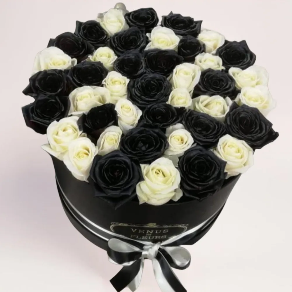 51 черно-белая роза в коробке Алматы выглядит взвешенно и продуманно до мелочей. Черные розы как символ глубины и драматизма, белые — балансируют и смягчают общее впечатление. Вместе они формируют ритмичный узор, который привлекает внимание с первого взгляда. Шляпная коробка в темном оттенке усиливает контраст и делает букет целостным и аккуратным.