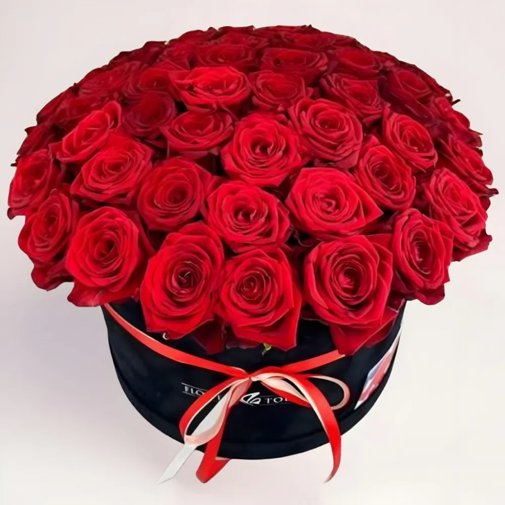 Шляпная коробка не только дополняет внешний вид букета, но и делает его практичным. Стебли скрыты, композицию удобно держать в руках, а одежда и руки остаются защищенными от шипов. 51 красная роза в коробке формируют плотную, ровную поверхность, которая выглядит целостно и дорого.