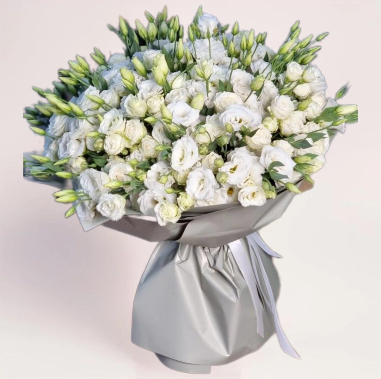 Объёмный букет из белой эустомы с плотными бутонами и аккуратной формой.