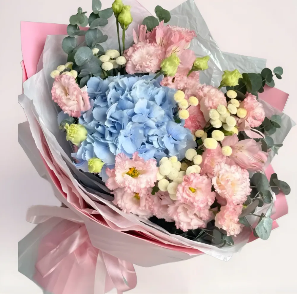 Нежный дизайнерский букет с голубой гортензией и эустомой в стильной упаковке. Премиальное оформление и бесплатная доставка по Алматы.