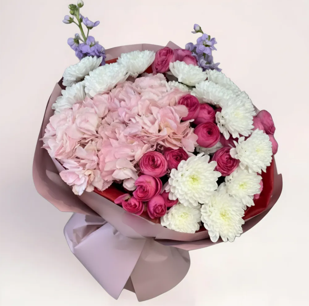 Нежный дизайнерский букет в бархатных оттенках с гортензией, розами и хризантемой. Премиальное оформление и бесплатная доставка по Алматы.