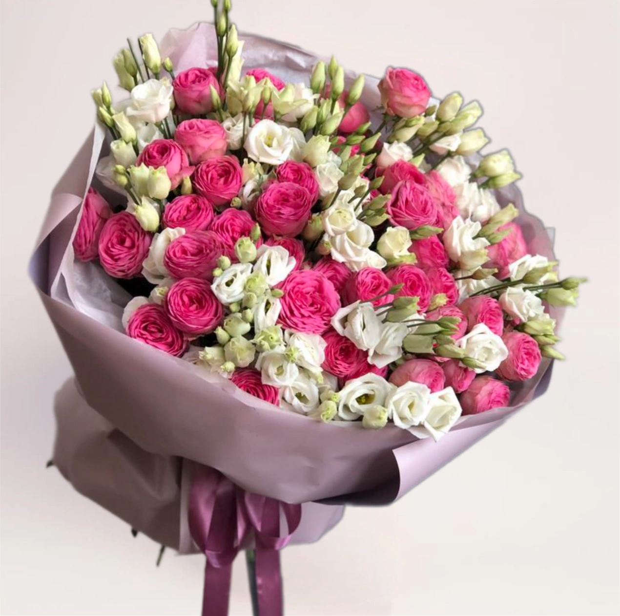 Объёмный букет из эустомы и роз в нежных розово-белых оттенках. Гармоничное сочетание цветов для особенного подарка.