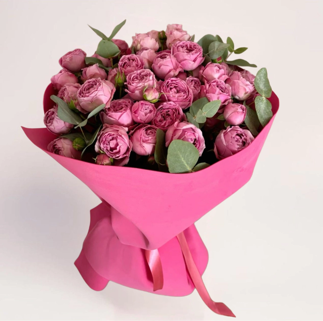 Этот букет создает ощущение завершенности. Пионовидные розы собраны в четкую, округлую форму, где каждый бутон поддерживает общий ритм композиции. Насыщенный розовый цвет не выглядит резким — благодаря глубоким оттенкам и текстуре лепестков он воспринимается как теплый и благородный. Зелень добавляет естественность и визуальные промежутки между цветами. Вы можете заказать букет из пионовидных роз Velvet Bloom Theory в Алматы с бесплатной доставкой на нашем сайте.