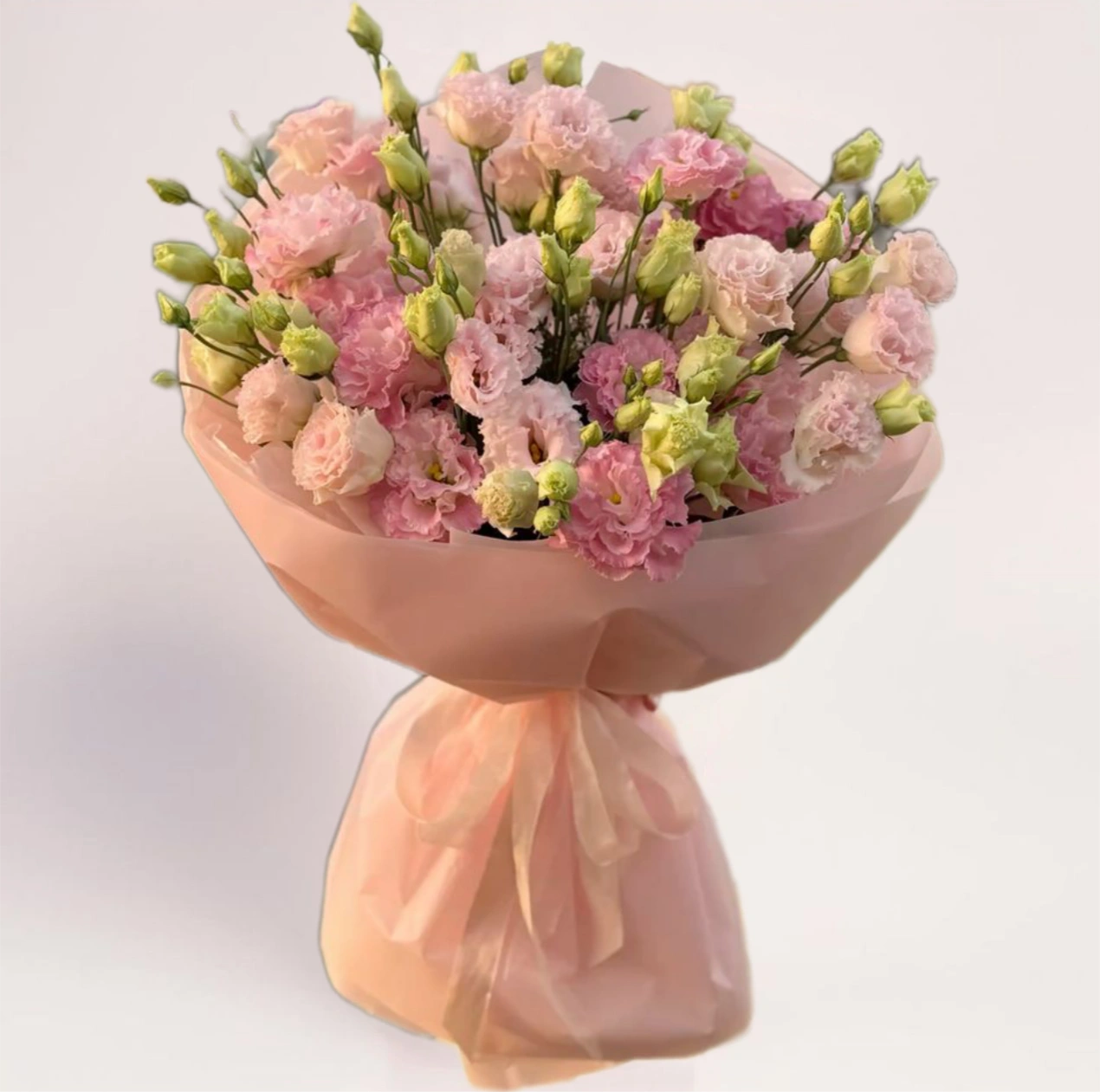 Пышный букет из розовой эустомы в мягкой пастельной гамме.