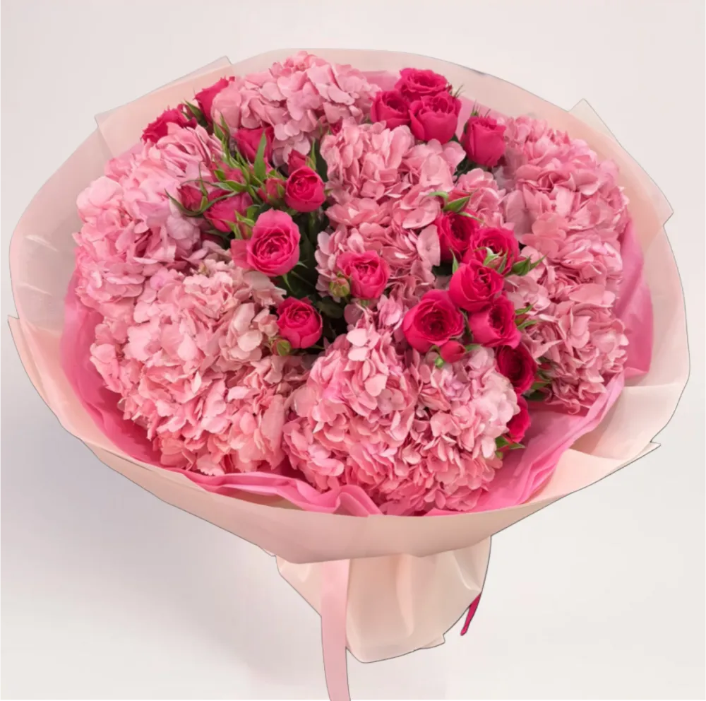 Пышный дизайнерский букет с розовой гортензией и кустовыми розами насыщенного оттенка в нежной розовой упаковке. Авторская композиция с объёмной формой и мягкой цветовой гармонией, идеально подходит для эффектного подарка и доставки цветов по Алматы.