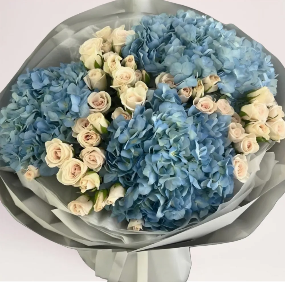 Нежный авторский букет с голубыми гортензиями и кремовыми розами в элегантной упаковке. Идеальный выбор, если вы хотите купить цветы в Алматы с быстрой и бесплатной доставкой.