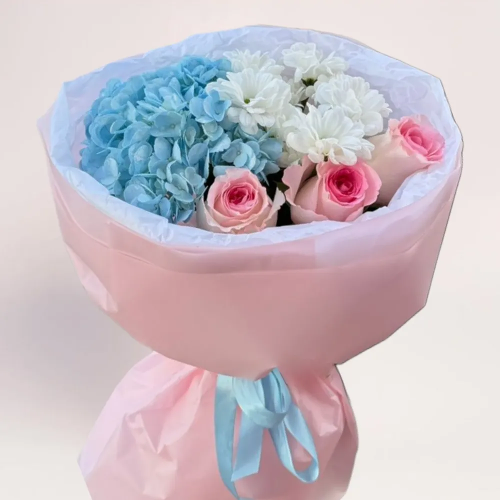 Нежный дизайнерский букет с голубой гортензией, розовыми розами и белыми хризантемами. Идеальный подарок на любой повод — купить цветы в Алматы с бесплатной доставкой.