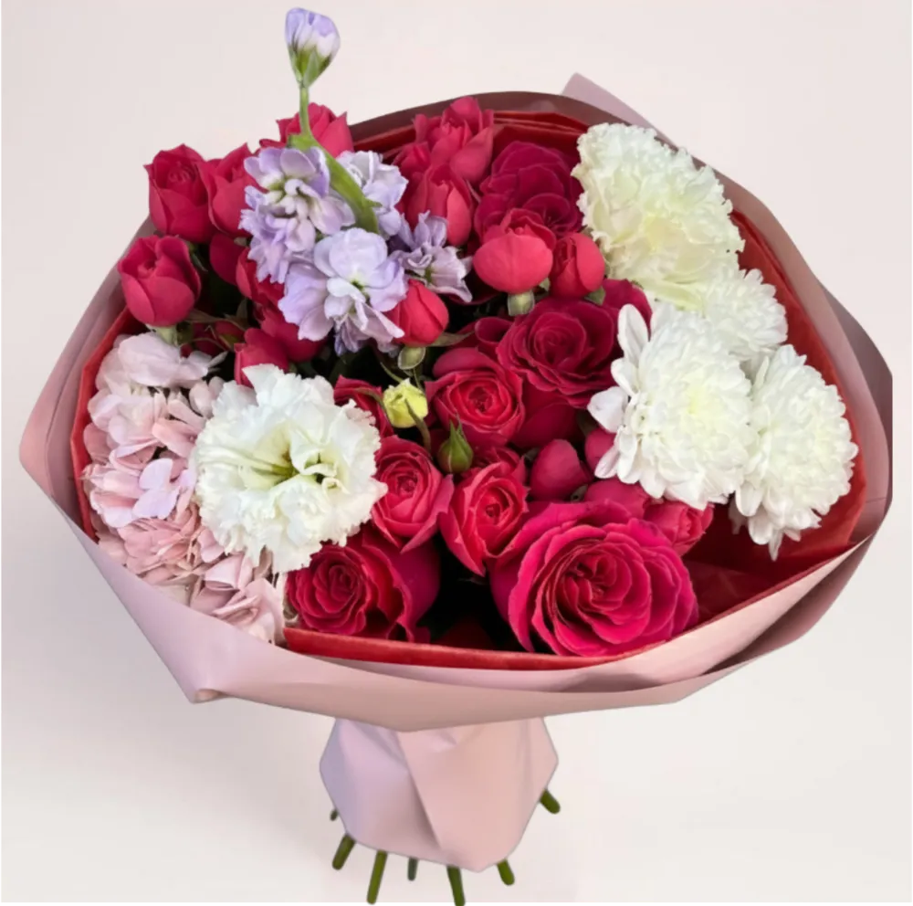 Дизайнерский букет с насыщенным и многослойным сочетанием оттенков. В композиции гармонично объединены розы глубоких розовых и красных тонов, гортензия, белые хризантемы и изящные цветочные акценты, которые придают букету глубину, объём и характер.