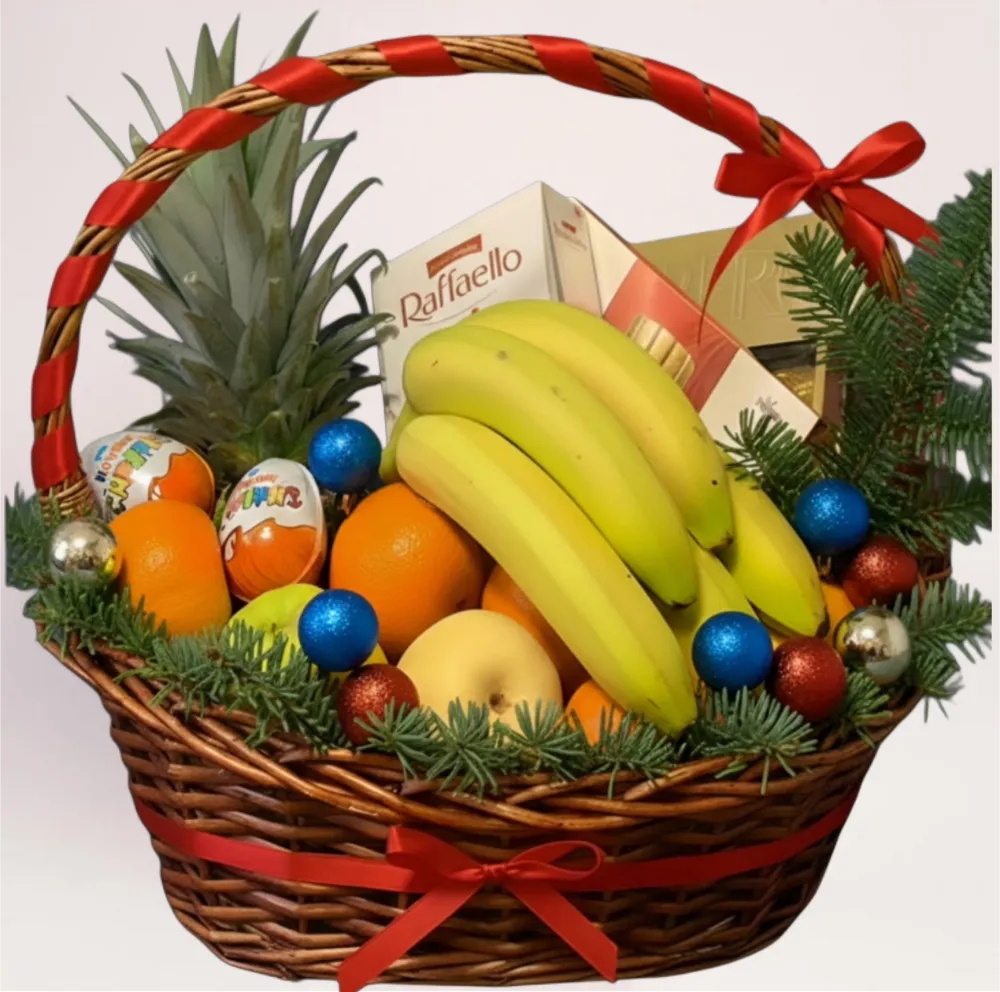 Подарочная фруктовая корзина — универсальный и эффектный подарок для зимних праздников и особых случаев. В составе свежие фрукты: ананас, бананы, апельсины, яблоки, а также сладости, аккуратно размещённые в плетёной корзине с хвойным декором и праздничными элементами.