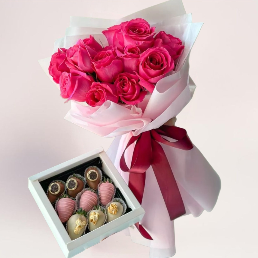 Можно купить и заказать комбо розы и клубника в шоколаде в Алматы с бесплатной и быстрой доставкой по городу. Быстро привезём по Алматы, в том числе благодаря точкам/партнёрам в разных районах — удобно, если подарок нужен срочно.