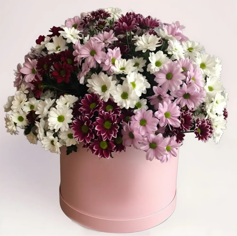 Коробка хризантем микс Алматы создана из сочетания природных и пастельных оттенков — от нежно-розовых до глубоких винных тонов. Флористы плотно формируют композицию, чтобы она выглядела объемной, аккуратной и гармоничной с любой стороны. Круглая форма коробки усиливает симметрию, объединяет цветы в единое целое и создает ощущение завершенного, статусного подарка. Композиция выглядит самодостаточно и не требует дополнительного оформления.