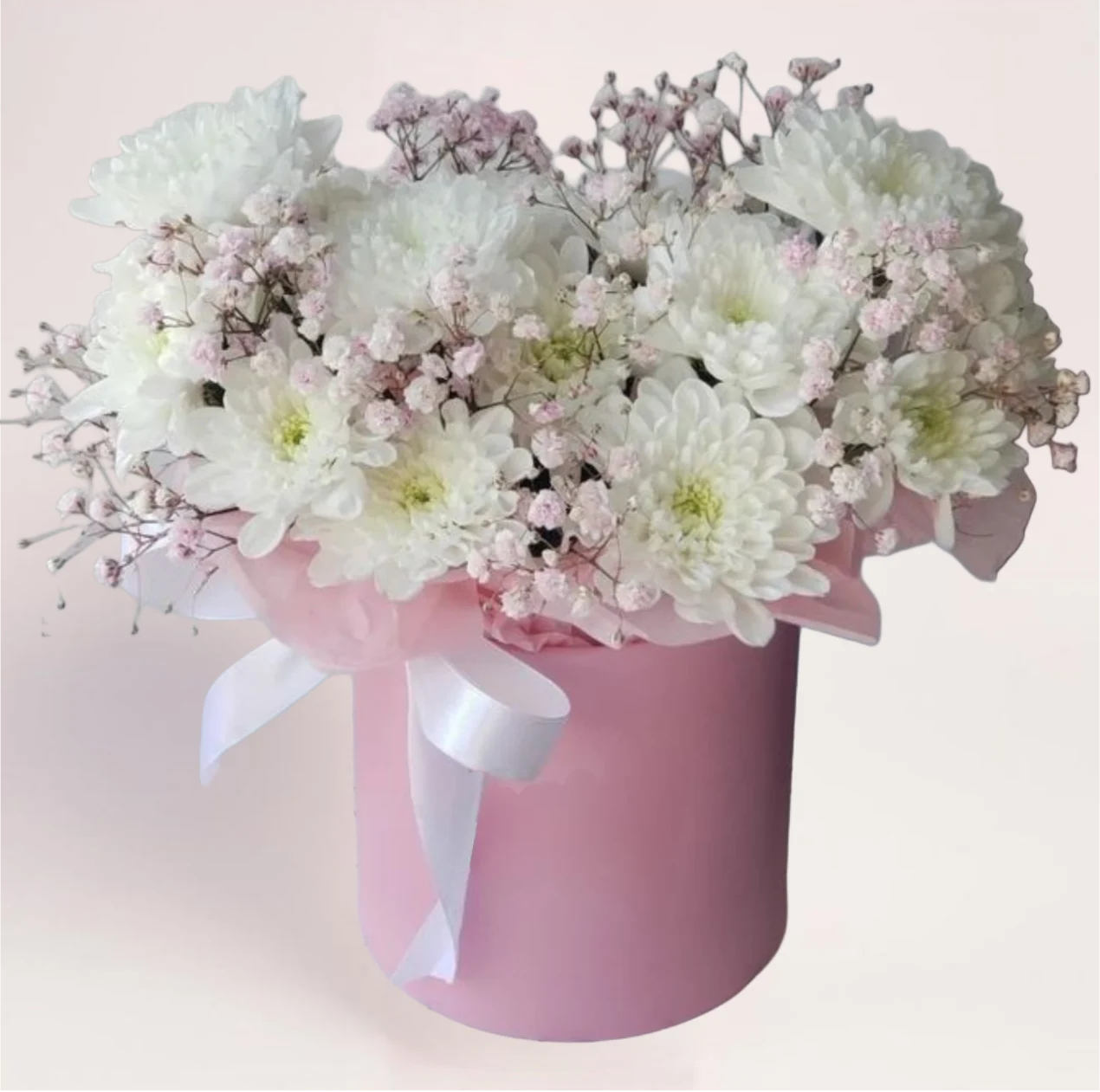 В композиции используются свежие хризантемы и гипсофила. Цветы собраны в плотную шляпную коробку с флористической губкой, что позволяет сохранить форму, свежесть и аккуратный внешний вид.