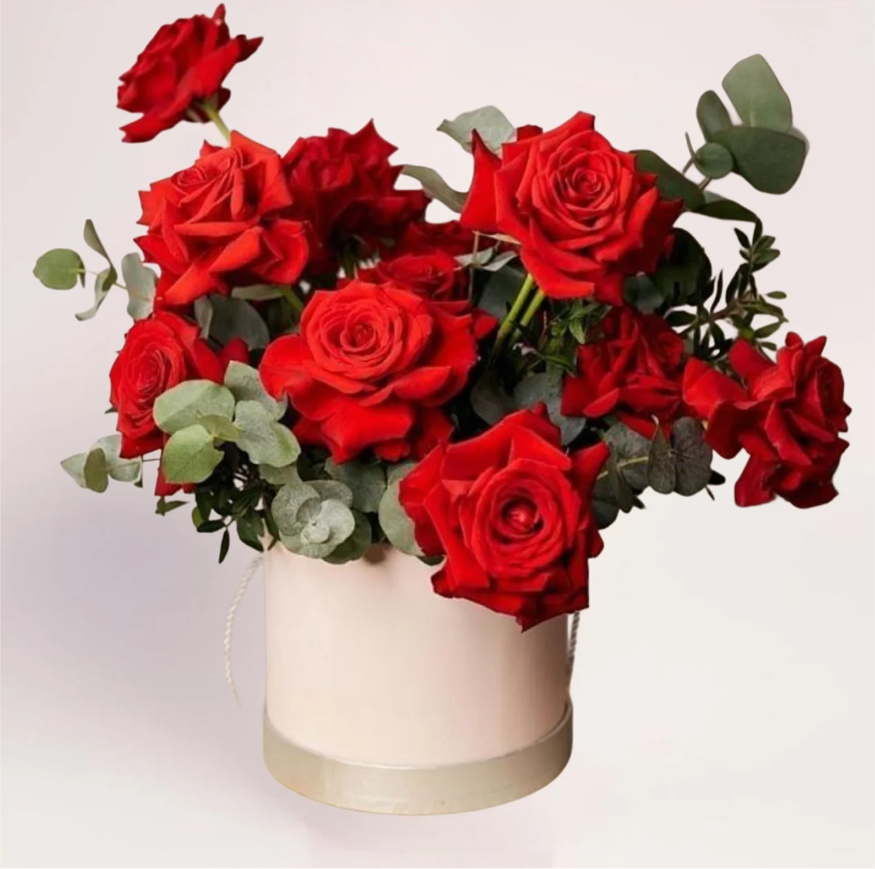 Коробка удобна тем, что букет не требует вазы и выглядит аккуратно сразу после вручения.