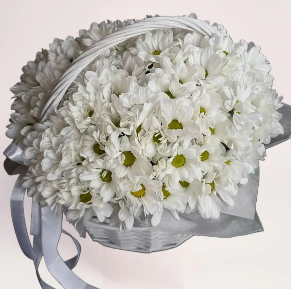 Корзина ромашковидных хризантем — это объемная, светлая композиция из белых цветов с зелеными серединками в плетеной корзине с аккуратной лентой. Она выглядит нежно, аккуратно и презентабельно, не требует вазы и сразу готова к вручению. Такой формат создает ощущение заботы, искренности и продуманного жеста. Корзина идеально подходит для важных поздравлений, благодарностей и приятных сюрпризов. Вы можете купить корзину ромашковидных хризантем с бесплатной доставкой по Алматы. Работаем круглосуточно и без выходных.