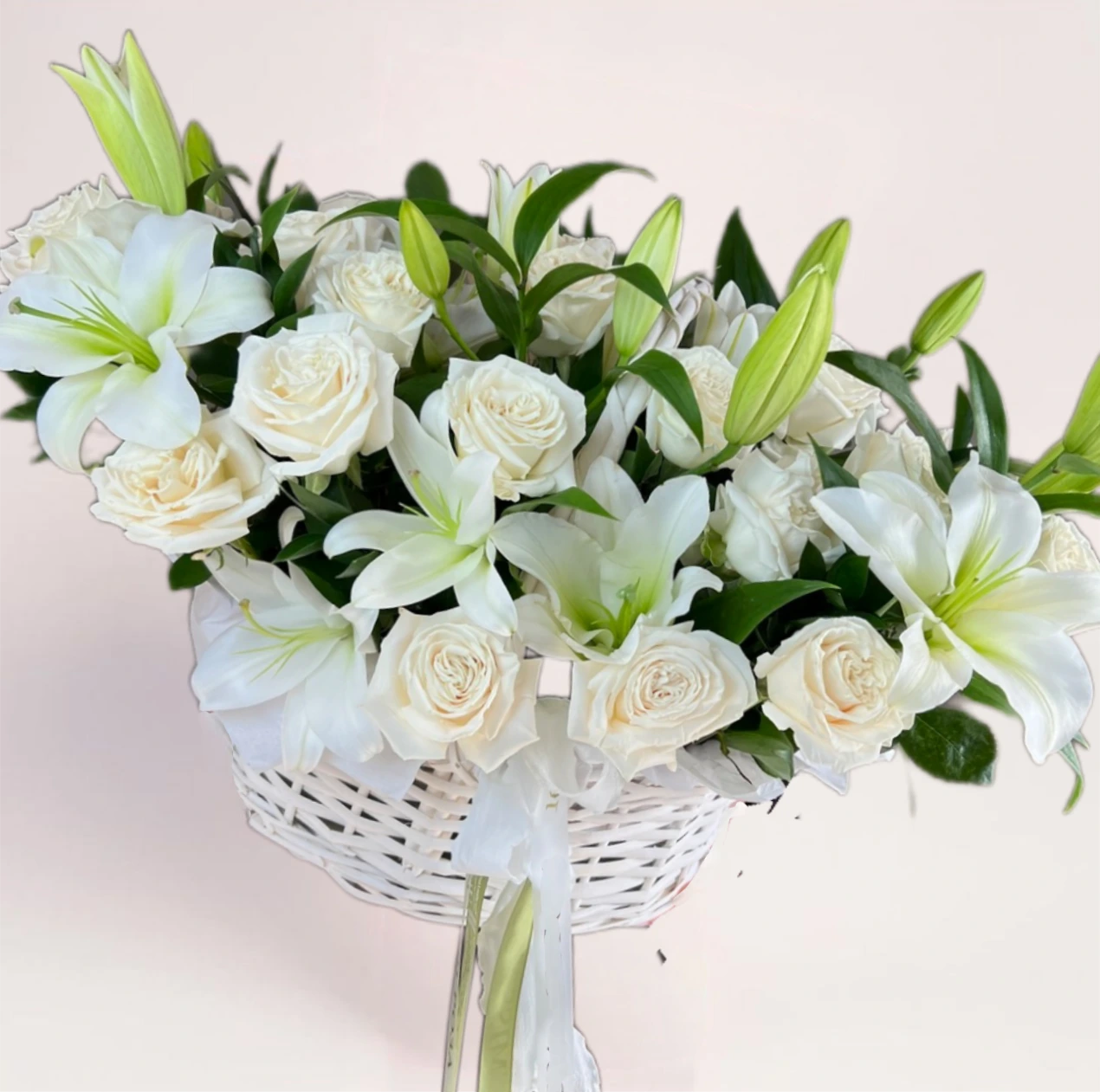 Корзина с белыми розами и лилиями с бесплатной доставкой по Алматы — элегантная цветочная композиция в светлой гамме, которая подчёркивает чистоту, уважение и искренность чувств. Белые розы и лилии смотрятся торжественно и аккуратно, создавая ощущение свежести и гармонии.