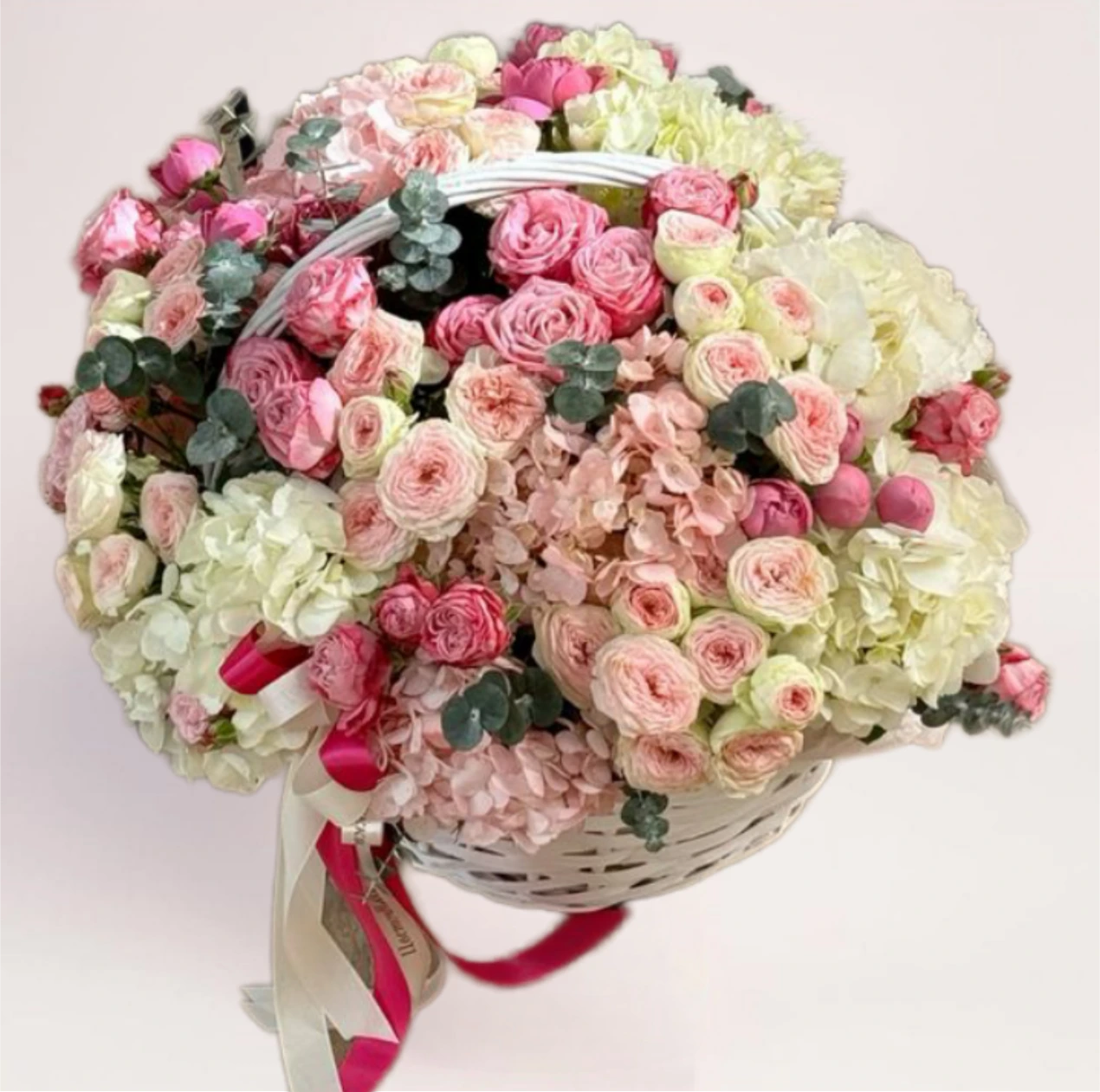 Корзина с пастельными розами и гортензией с бесплатной доставкой по Алматы — объёмная и нежная цветочная композиция в светлых оттенках. Сочетание пионовидных роз, гортензии и декоративной зелени создаёт эффект «воздушного облака», который сразу привлекает внимание и выглядит дорого.