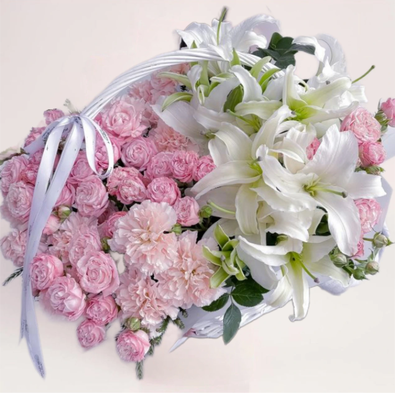 Корзина с розовыми розами и белыми лилиями с бесплатной доставкой по Алматы — нежная и объёмная композиция в светлой гамме, которая передаёт тепло, заботу и искренние эмоции. Сочетание розовых оттенков и белых лилий делает корзину выразительной, но при этом лёгкой и аккуратной.