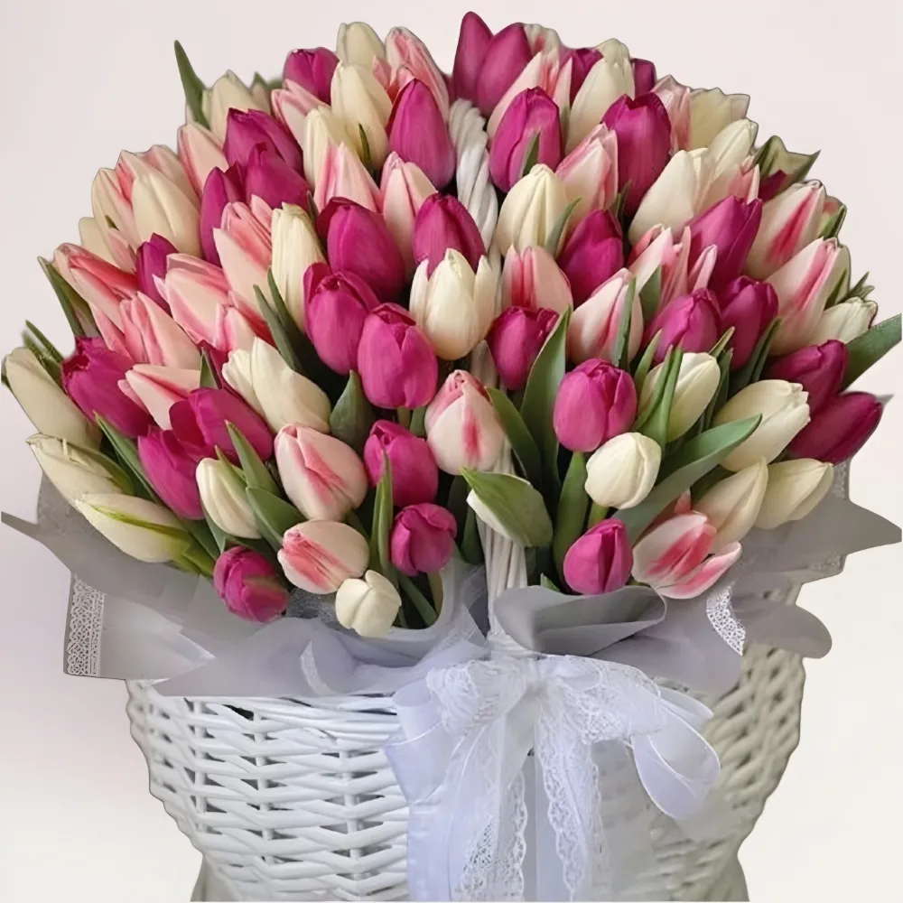 Корзина тюльпанов — это изящная цветочная композиция, которая привлекает внимание своей аккуратностью. Сочетание нежно-розовых, кремовых и насыщенно-малиновых тюльпанов создает мягкий, гармоничный переход цветов без резких контрастов. Плетеная белая корзина подчеркивает легкость композиции, а декоративная лента и оформление добавляют ощущение завершенности и праздничности. Такой формат выглядит аккуратно со всех сторон и не требует дополнительной упаковки. У нас можно купить корзину тюльпанов с бесплатной доставкой по Алматы. Удобный заказ онлайн или по телефону.