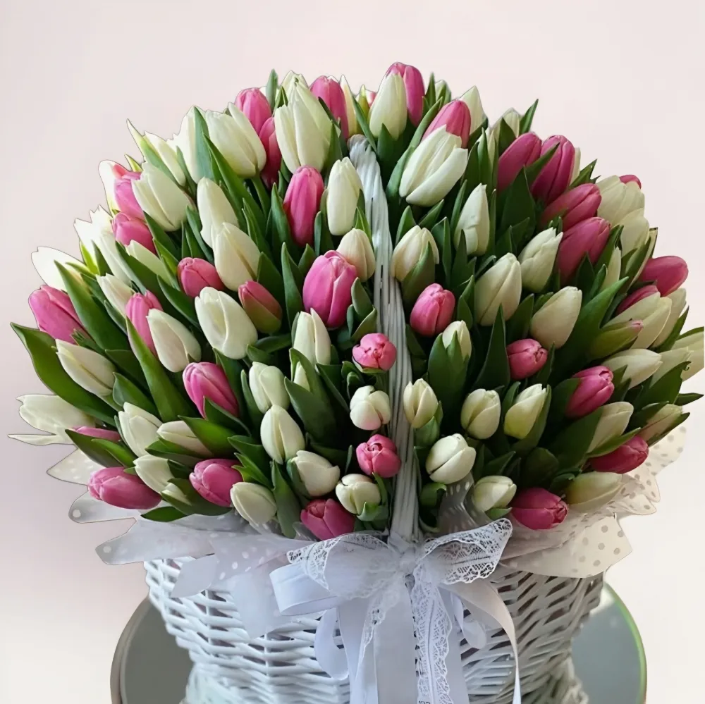 Эта корзина тюльпанов Алматы объединяет в себе четкую симметрию и равномерное заполнение пространства. Бутоны размещены плотно и одинаково по всей поверхности композиции, благодаря чему она выглядит собранно, аккуратно и очень презентабельно. Сочетание белых и нежно-розовых тюльпанов создает мягкий контраст без резких переходов. Такой дизайн часто ассоциируется с премиальными витринными композициями. Вы можете купить корзину с тюльпанами и выбрать удобное время доставки.