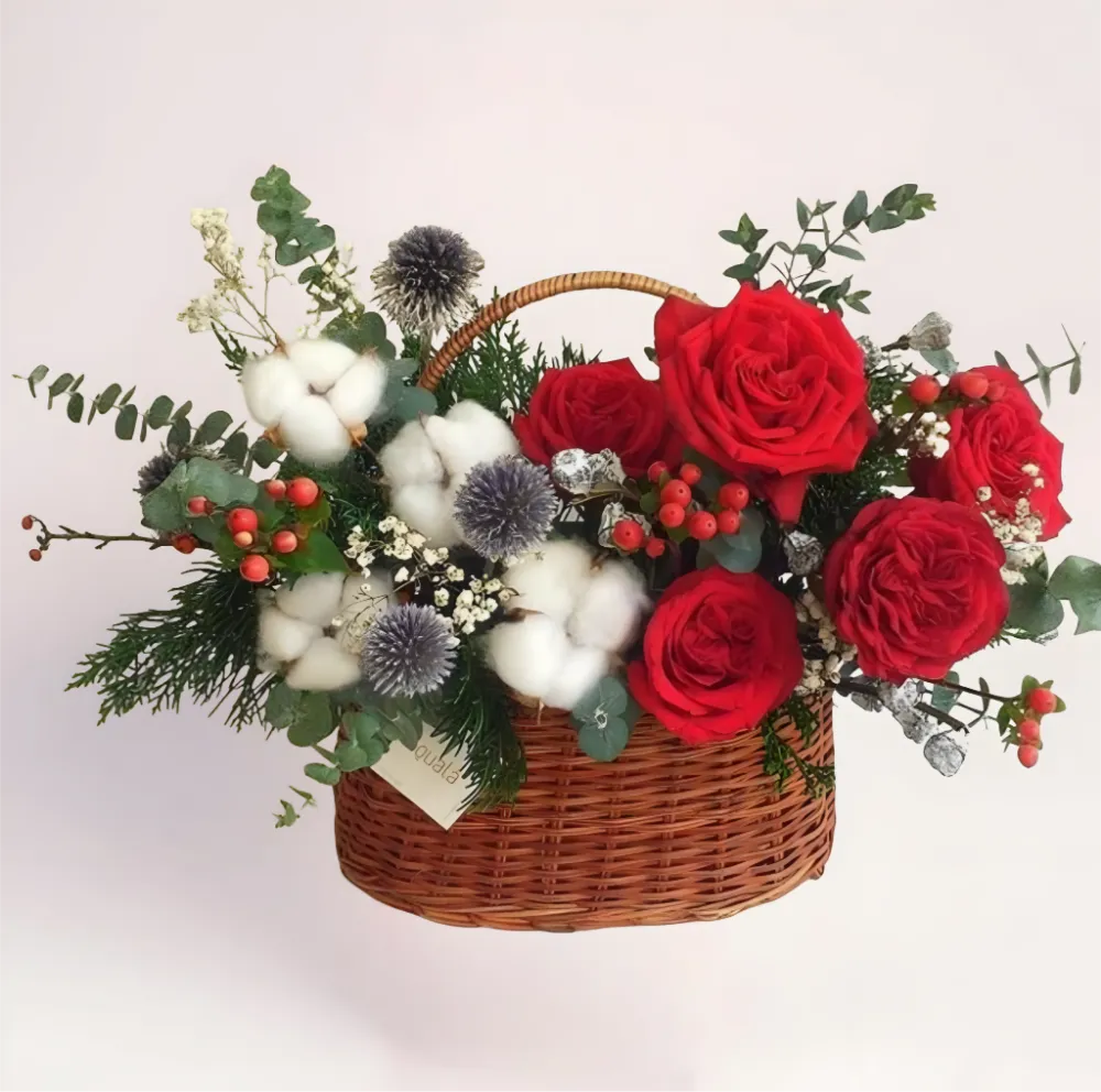 Новогодняя цветочная корзина с красными розами, хлопком и хвойным декором — стильный праздничный подарок с доставкой по Алматы.