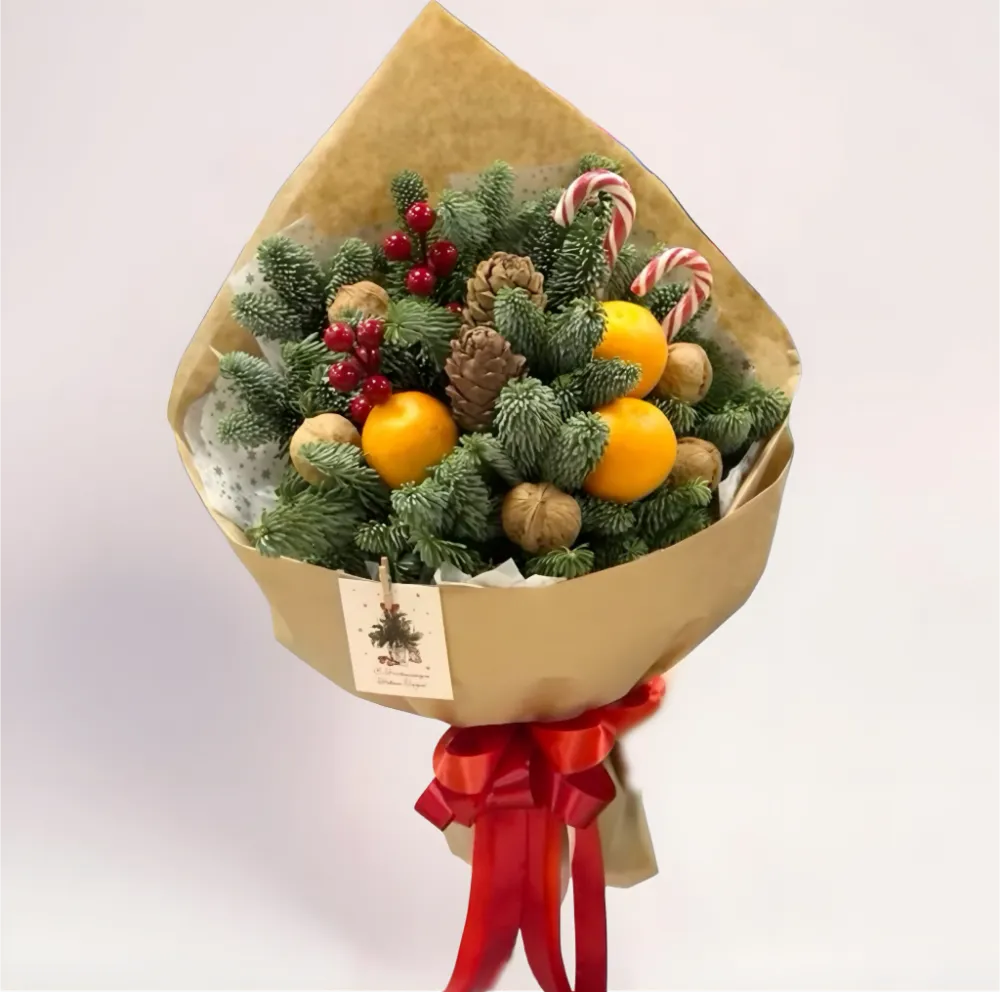 Новогодний букет с хвоей, мандаринами и зимним декором — праздничный подарок с бесплатной доставкой по Алматы.
