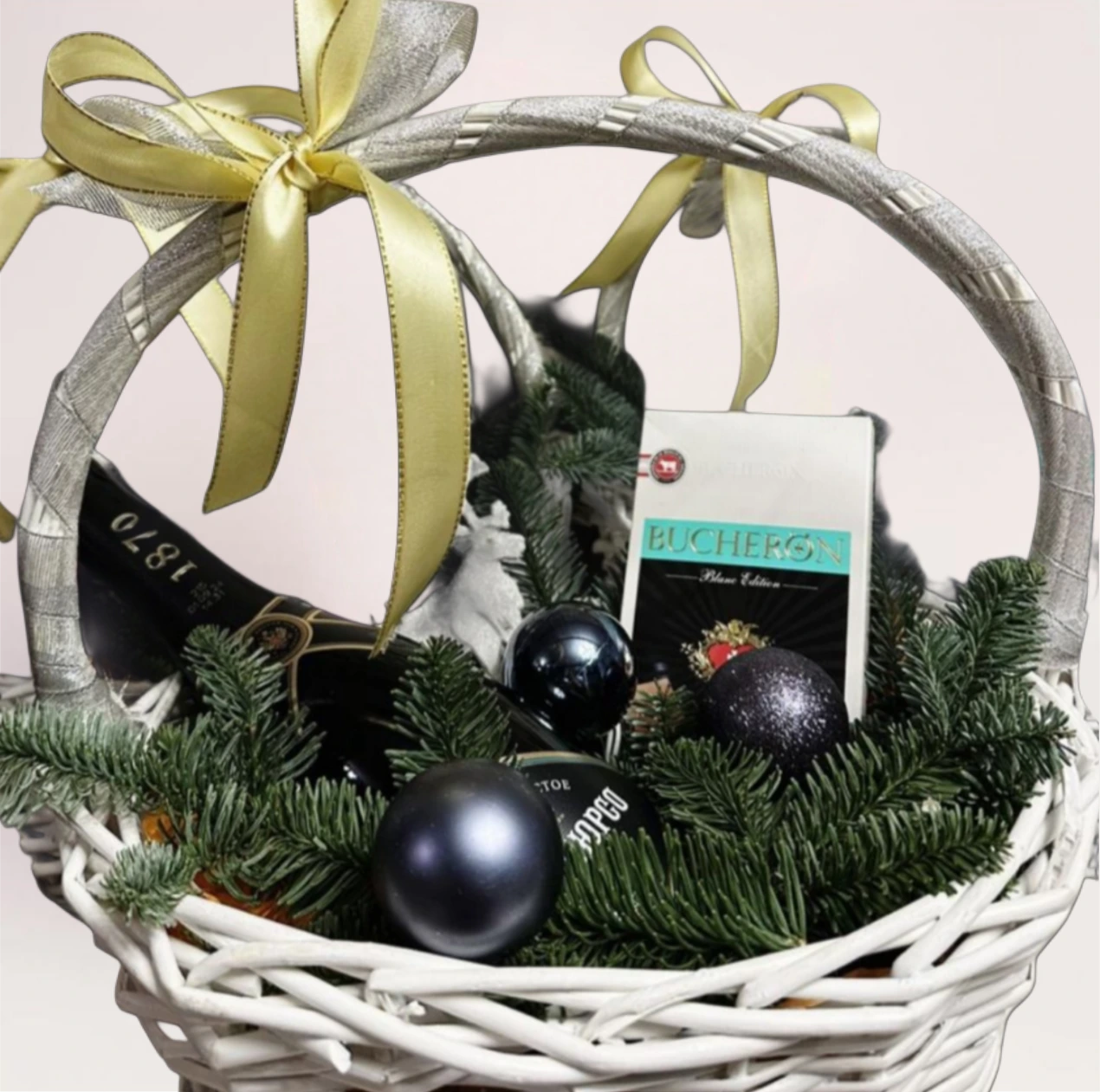 Новогодняя корзина Black Gold Basket — элегантная подарочная композиция в светлой плетеной корзине с игристым вином, темным шоколадом, хвойными ветками и праздничным декором. На фото корзина выглядит сдержанно и дорого. Черные матовые и глянцевые шары, густо выложенная хвоя, бутылка игристого и плитка шоколада Bucheron формируют образ зимней классики с акцентом на стиль. Золотая лента на ручке добавляет благородство и делает композицию завершенной без лишних деталей. Такой подарок выглядит статусно и уместно для особого поздравления. Вы можете купить Black Gold Basket в Алматы с бесплатной доставкой. Мы принимаем заказы онлайн или по телефону без выходных.