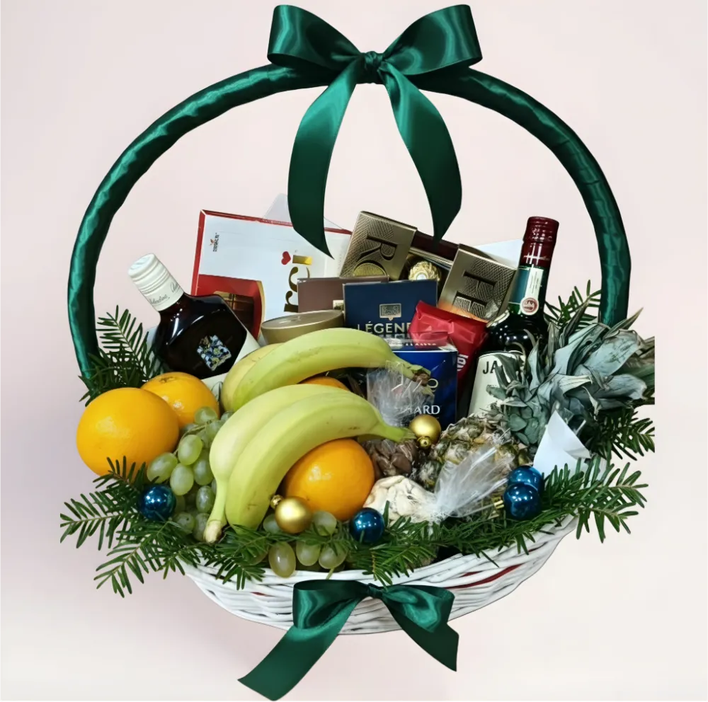 Внутри — сочетание свежих фруктов, сладостей и напитков, подобранных в подарочном формате. Такая новогодняя корзина отлично подойдёт для поздравления партнёров, коллег, руководителей и близких, когда нужен солидный и запоминающийся подарок.