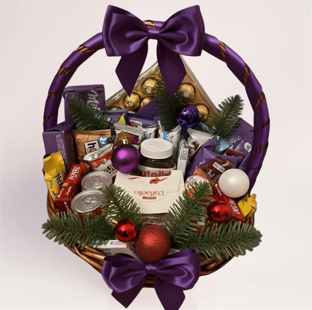 Такой формат отлично подходит для поздравления коллег, близких и партнёров: корзина выглядит презентабельно, не требует дополнительной упаковки и сразу готова к вручению. Внутри — популярные сладости и десерты, которые любят и взрослые, и подростки, поэтому это универсальный вариант для новогодних подарков.