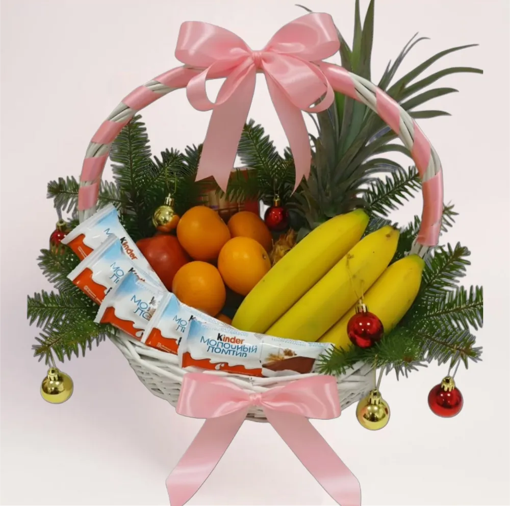 Внутри свежие фрукты и популярные сладости, которые подойдут как детям, так и взрослым. Такой подарок уместен для семейного поздравления, дня рождения, благодарности или приятного сюрприза без повода. Корзина выглядит нежно и презентабельно, не требует дополнительной упаковки.