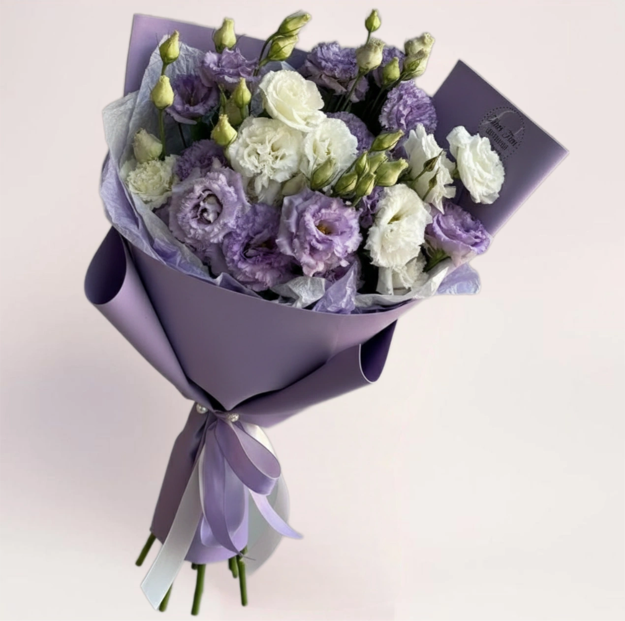 Нежный букет из сиреневой и белой эустомы в спокойной пастельной гамме. Воздушная композиция с аккуратной упаковкой — универсальный вариант для подарка, поздравления или тёплого знака внимания.