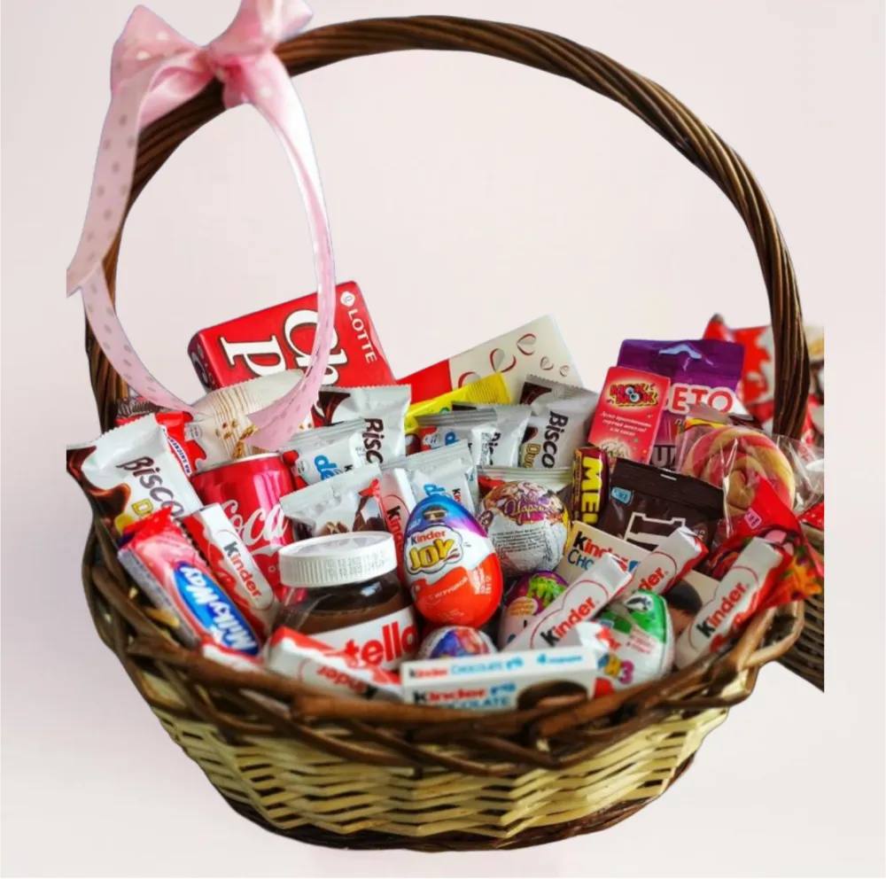 Подарочная сладкая корзина с шоколадом и сладостями — универсальный подарок для детей и взрослых с бесплатной доставкой по Алматы.