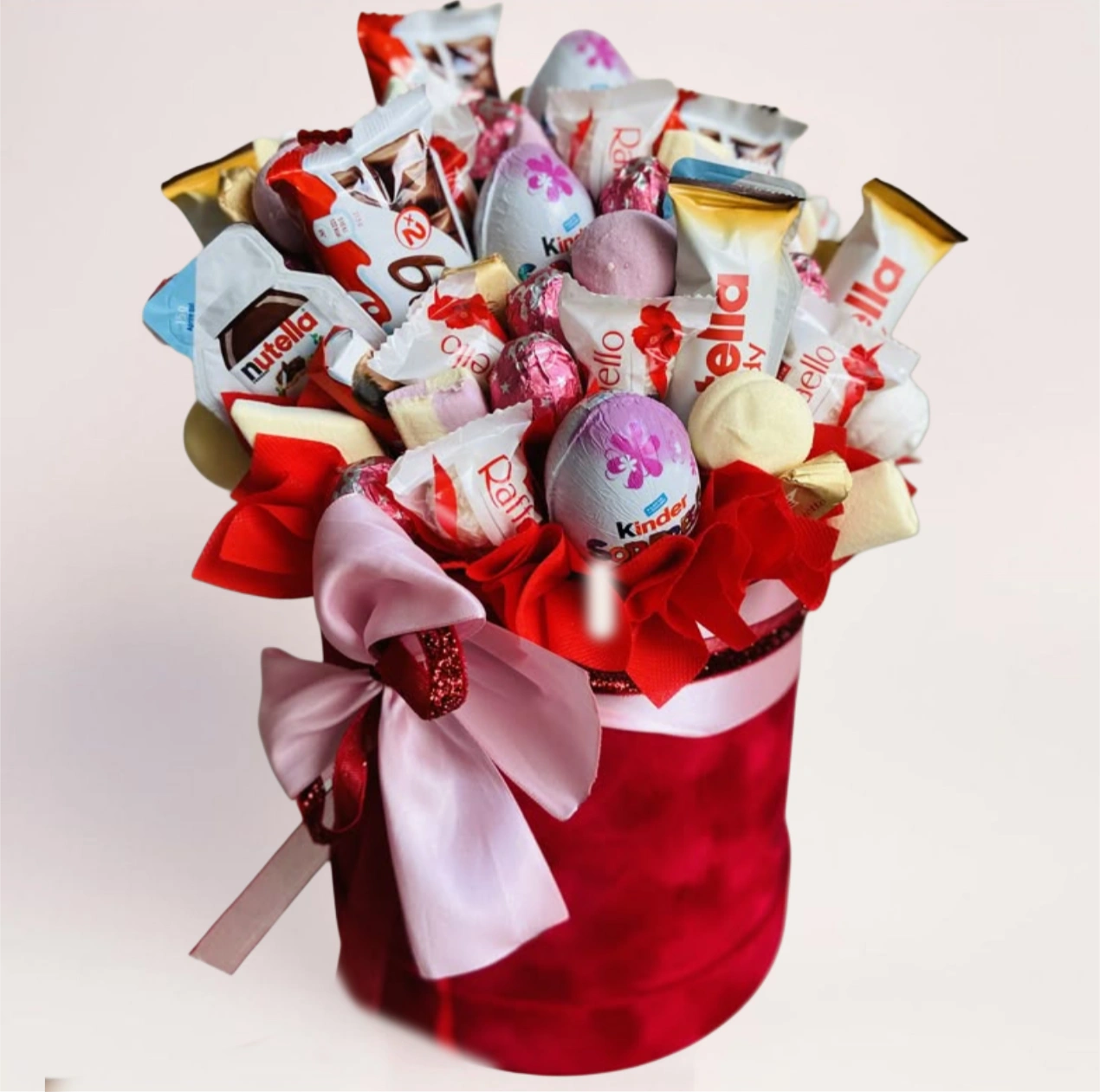 — Яркая коробка со сладостями Kinder, Nutella и шоколадными конфетами, аккуратно оформленная и полностью готовая к вручению. Такой подарок выглядит эффектно и сразу создаёт праздничное настроение.