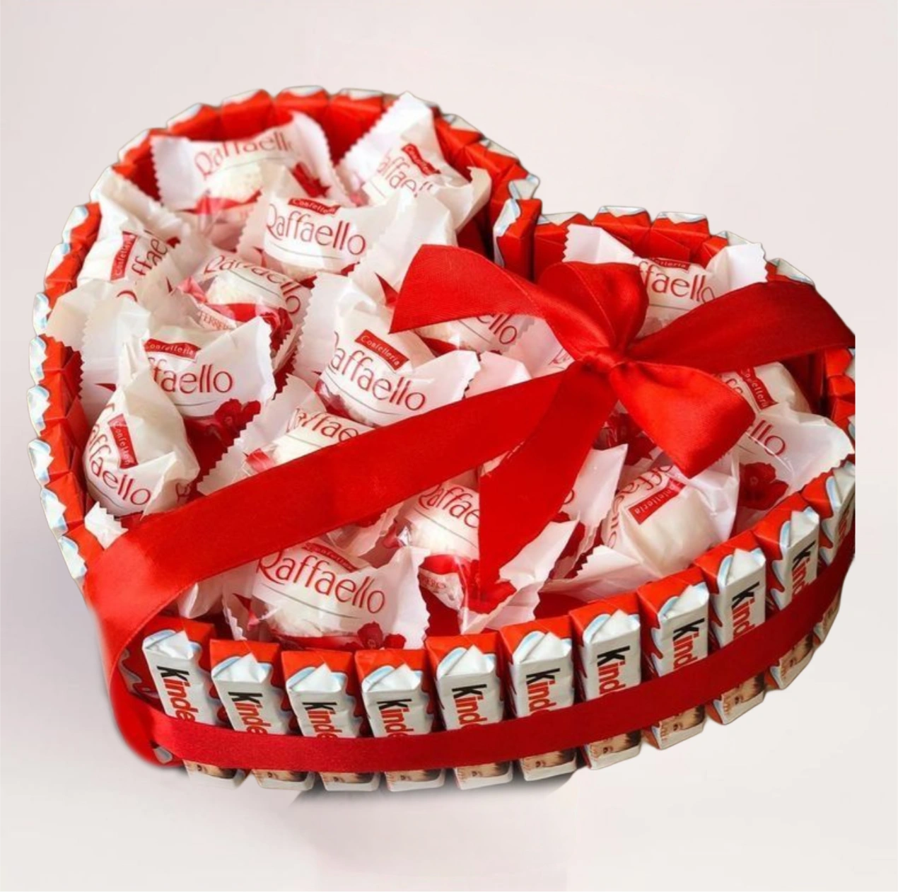 Сладкий подарочный набор с конфетами Raffaello и шоколадом Kinder оформлен в виде сердца — символичный и эффектный вариант для поздравления близкого человека.